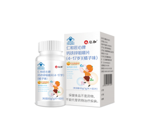 仁和匠心牌鈣鐵鋅咀嚼片(4-17歲)(橘子味) 【原料】碳酸鈣,富馬酸亞鐵,葡萄糖酸鋅 【輔料】食用葡萄糖,乳粉,D-甘露糖醇,麥芽糊精,硬脂酸鎂,檸檬酸,橘子 香精 【功效成分及含量】每片含:鈣164.64mg鐵3.16mg鋅1.93mg 【適宜人群】需要補充鈣、鐵、鋅的 4-17 歲人群 【不適宜人群】3歲以下人群及成人、孕婦、乳母 【保健功能】補充鈣、鐵、鋅 【食用量及食用方法】每日 1 次